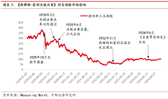 股市方面,《斯穆特-霍利关税法案》的通过也进一步冲击了市场决心。1929岁暮股灾迸发后,道琼斯指数曾正在1930岁首年月有所反弹。然而,跟着正在1930年3月通过关税法案以及对胡佛签订的预期加强,投资者情感再度恶化。昔时6月,《斯穆特-霍利关税法案》正式签订的动静使股市蒙受新一轮暴跌,签订法案当周道指暴跌超10%。市场遍及认识到商业和将使企业发卖和盈利落井下石,进一步冲击了投资者对美国经济的决心。